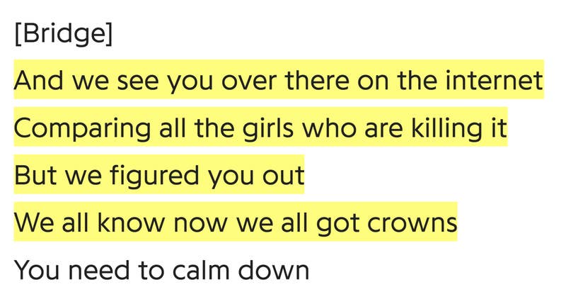 Obviously, the song is a bop, but we need to focus on the lyrics for a second. Because even though Taylor said her new music had "political undertones", she was completely lying about the "under" bit.