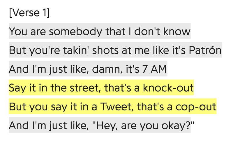 For example, the first verse is a criticism of toxic online culture, calling out people who hide behind anonymous profiles to send hate.
