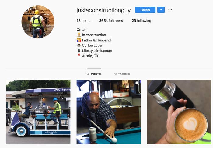 Only created in May, @justaconstructionguy already has more than 366,000 followers. It featured a guy named "Omar," an average construction worker and dad who's ribbing on influencer culture for fun.